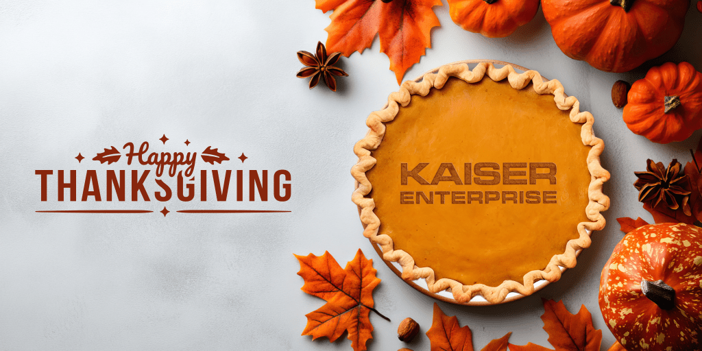 For a Thanksgiving holiday concept, I used Photoshop to transform Kaiser Enterprise brand logos into pumpkin pie designs, creating a laser-engraved effect baked directly into each pie.